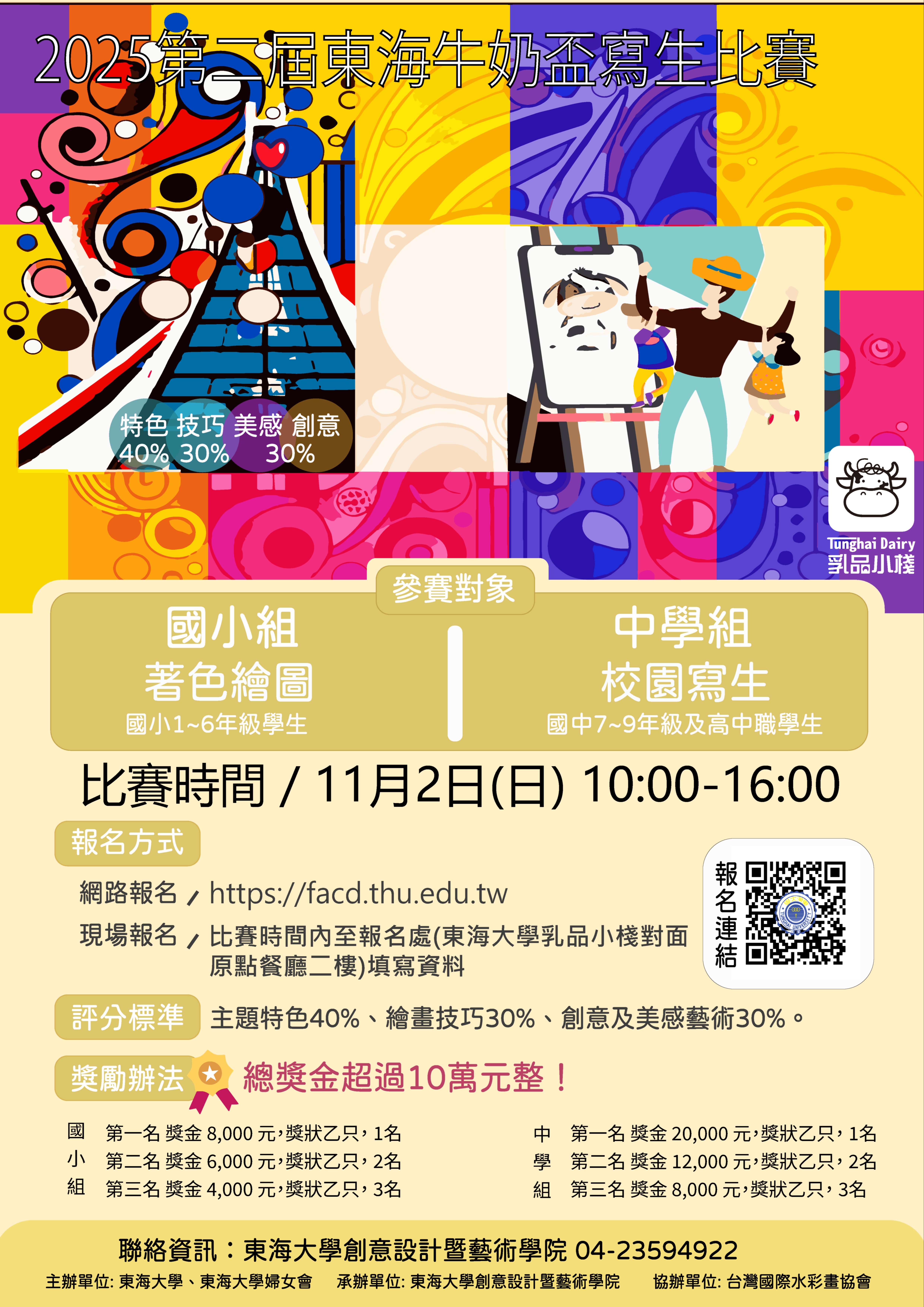 三、 比賽資訊及線上報名連結,請逕上該校創意設計暨藝術學院網站公告:https://facd.thu.edu.tw 。