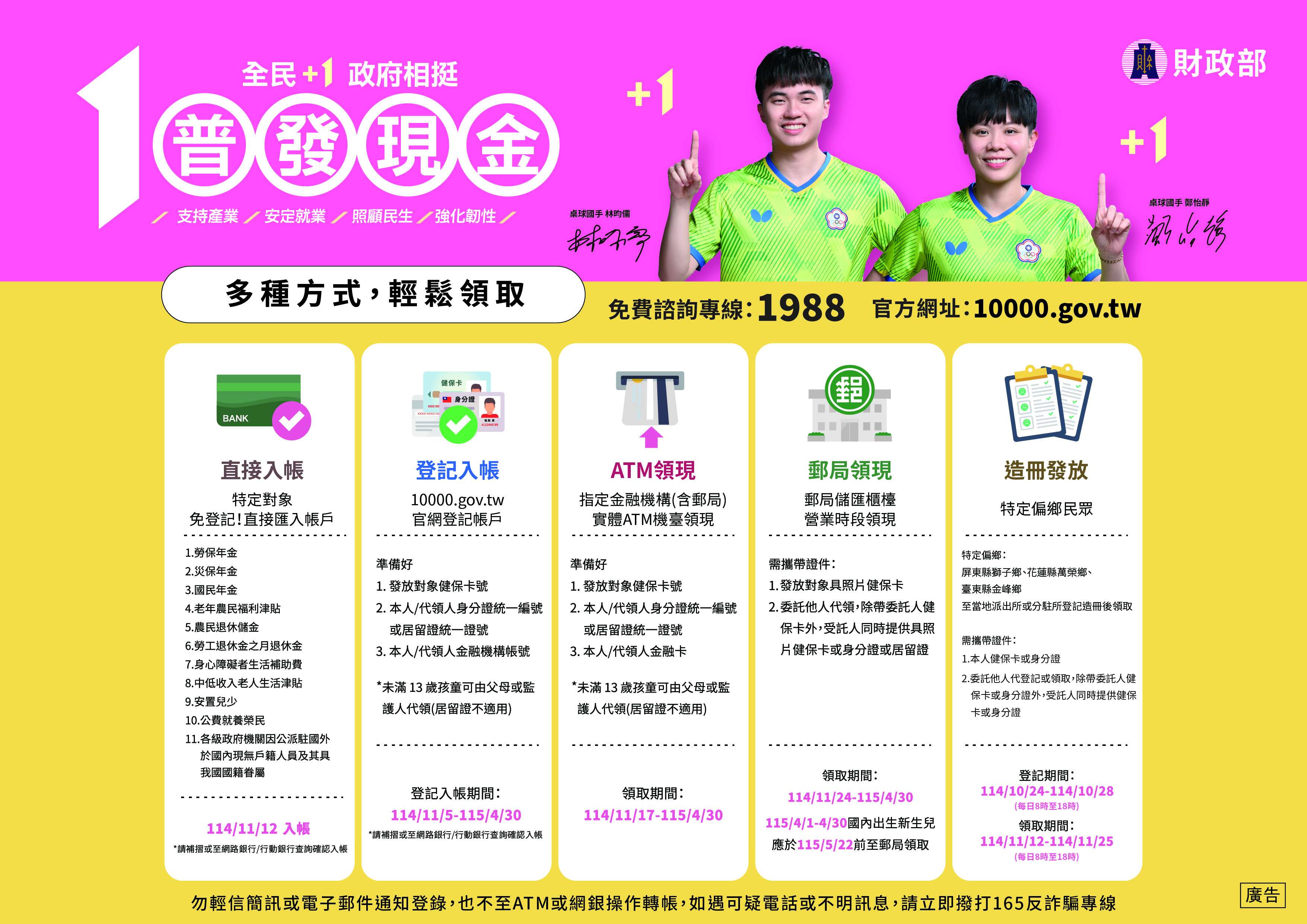 三、 為讓民眾即時取得普發現金正確資訊,避免遭詐騙,財政部除透過新聞稿及記者會加強宣導外,並建置普發現金廣宣網站(10000.gov.tw)於本(114)年10月23日啟用,及免付費客服專線1988,於同年10月24日正式上線。