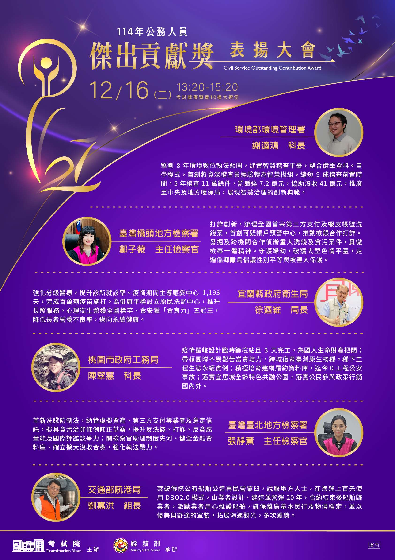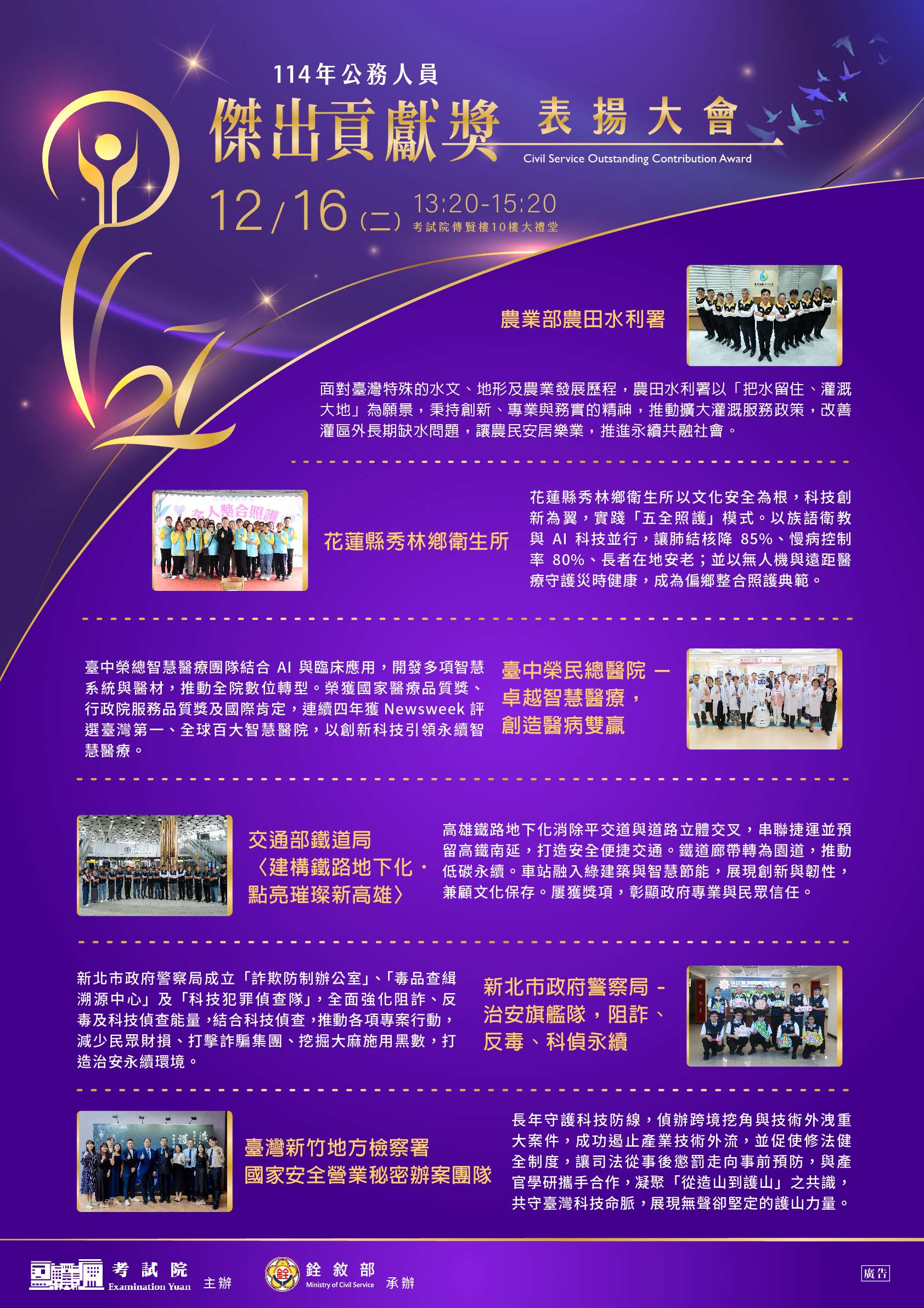 主旨:銓敘部書函請協助公告「114年公務人員傑出貢獻獎表揚大會」電子海報一案,請查照。