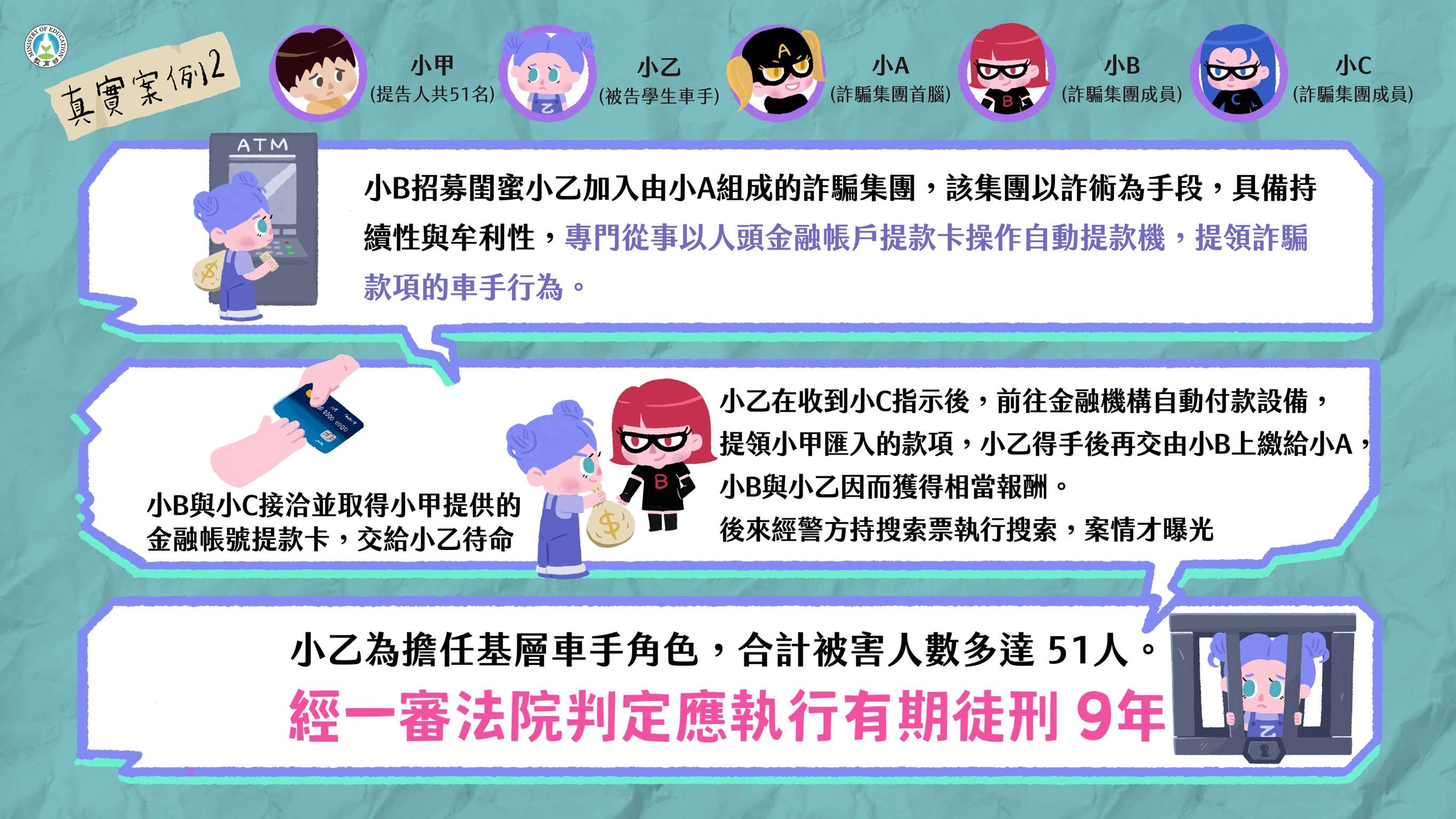 二、 近年來學生擔任車手涉詐欺案件數攀升,尤以12至23歲涉案最多,教育部藉由真實案例,解析學生擔任詐騙車手所可能承擔的法律責任,製作本案懶人包,避免學生遭不法分子利用,衍生後續的法律風險與責任。