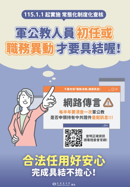 主旨:檢送大陸委員會修正「常態化、制度化查核人員範圍表」及宣傳海報各1份,請查照。