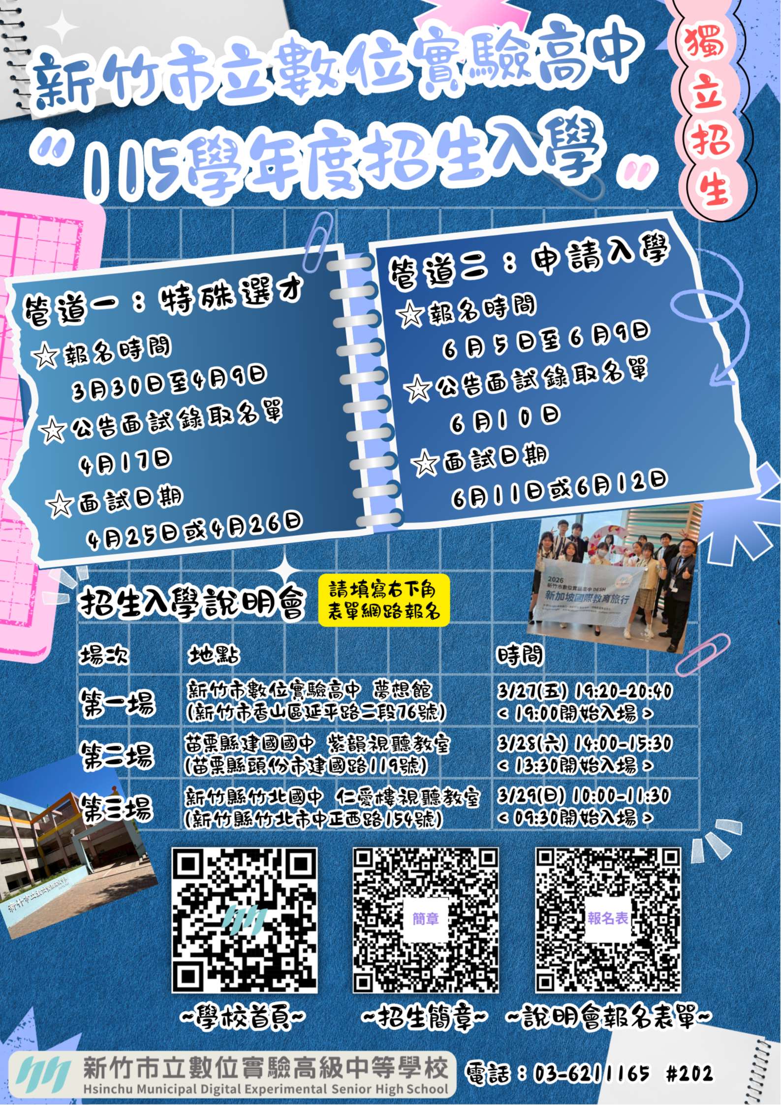 | 本校將於3/27-3/29辦理三場實體招生入學說明會,歡迎親師生就近選擇場次報名,報名連結為:https://pse.is/8ukye9。因場地座位有限,若額滿將停止報名。各場次資訊如下,其他詳細資料請參閱附件二: |