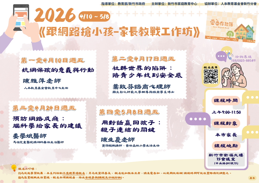 新竹市家庭教育中心自4月10日起開辦「跟網路搶小孩-家長教戰工作坊」系列活動,講座主題豐富,包含網路成癮防治、青少年心理支持及親子對話技巧等,歡迎家長們踴躍報名參與!